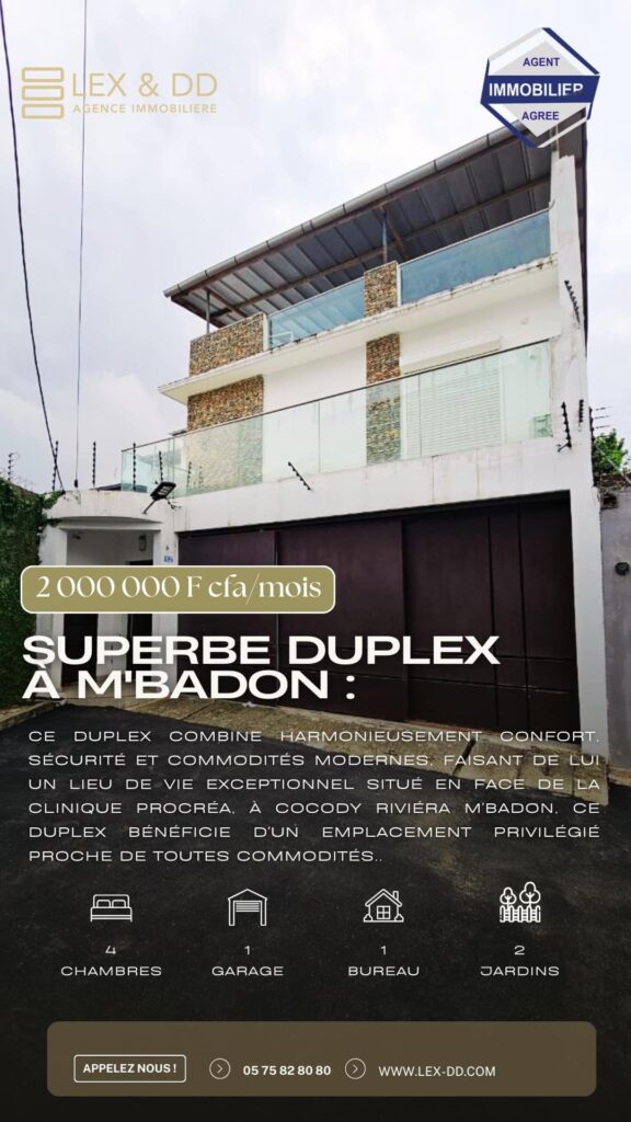 Superbe Duplex à louer, situé Cocody Riviéra M’Badon en face de la Clinique Procréa. Elle offre un cadre de vie exceptionnel.