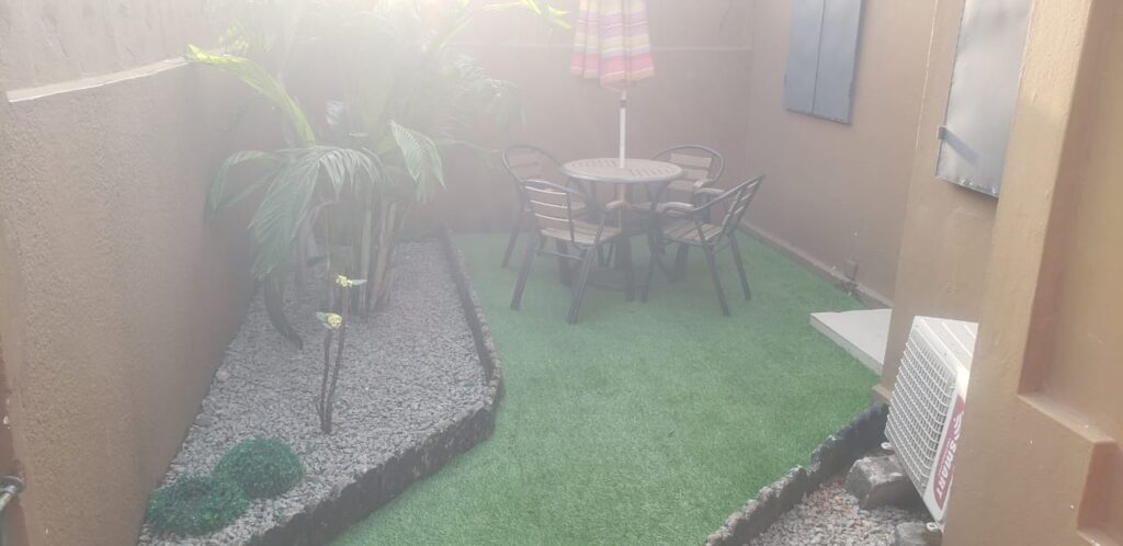 - Cour avant avec gazon synthétique pour un environnement agréable.